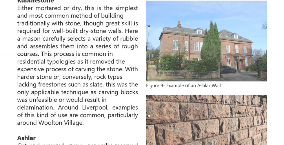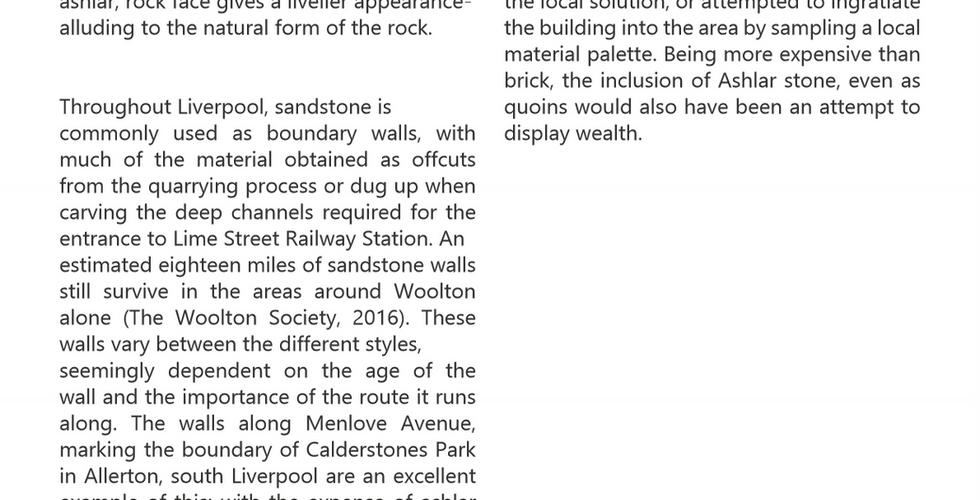 This thesis allowed me to look at the prolific use of local stone around Liverpool and investigate why such use diminished despite the apparent visual benefits. It was also interesting to research what the future may hold for the material, with efforts to reduce climate change potentially allowing it to grow in popularity once again.